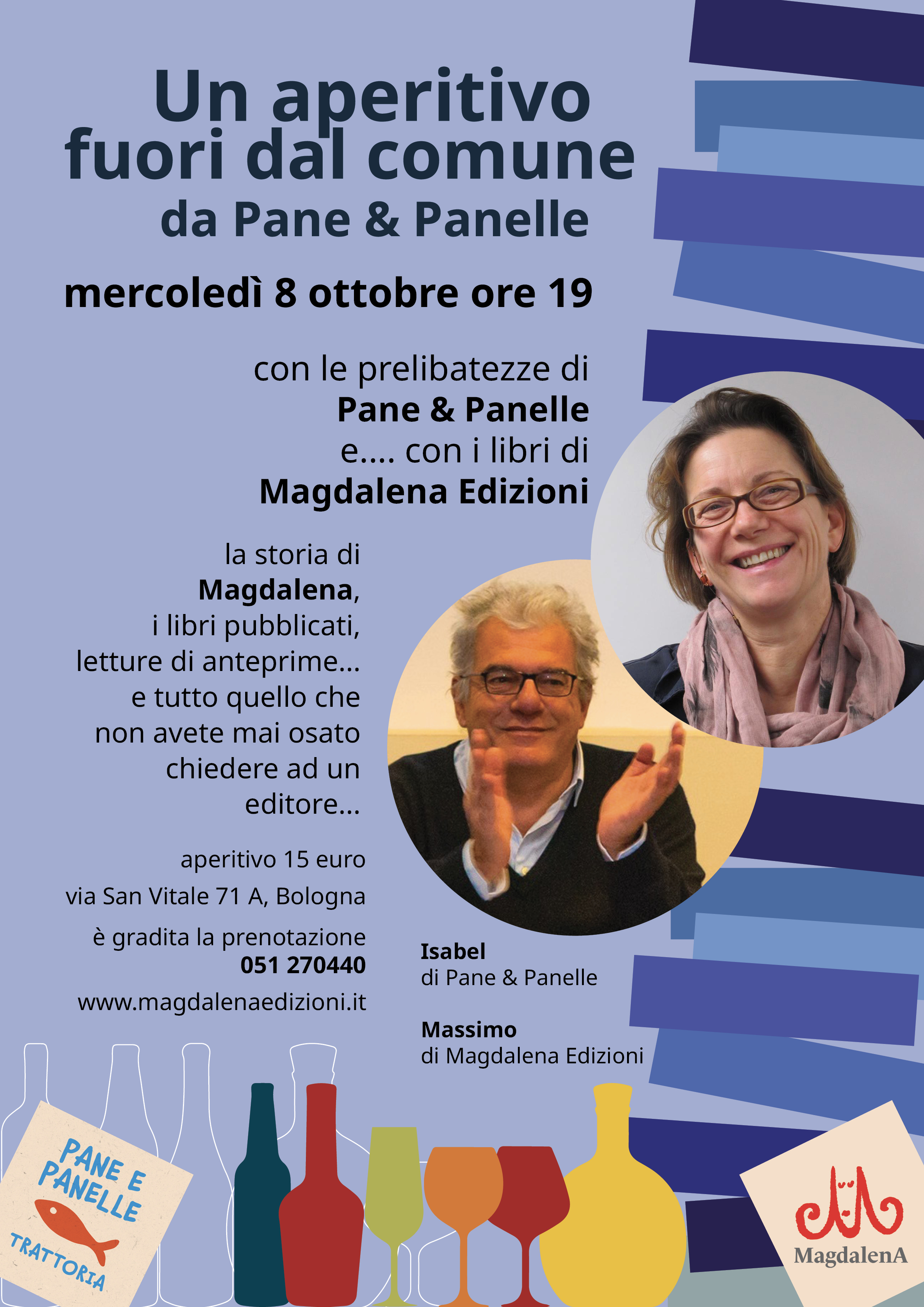 Magdalena Edizioni oresenterà i suoi libri nel corso di "Un aperitivo fuori dal comune", alle ore 19.00 presso il ristorante Pane & Panelle, Via San Vitale 71 A, Bologna.